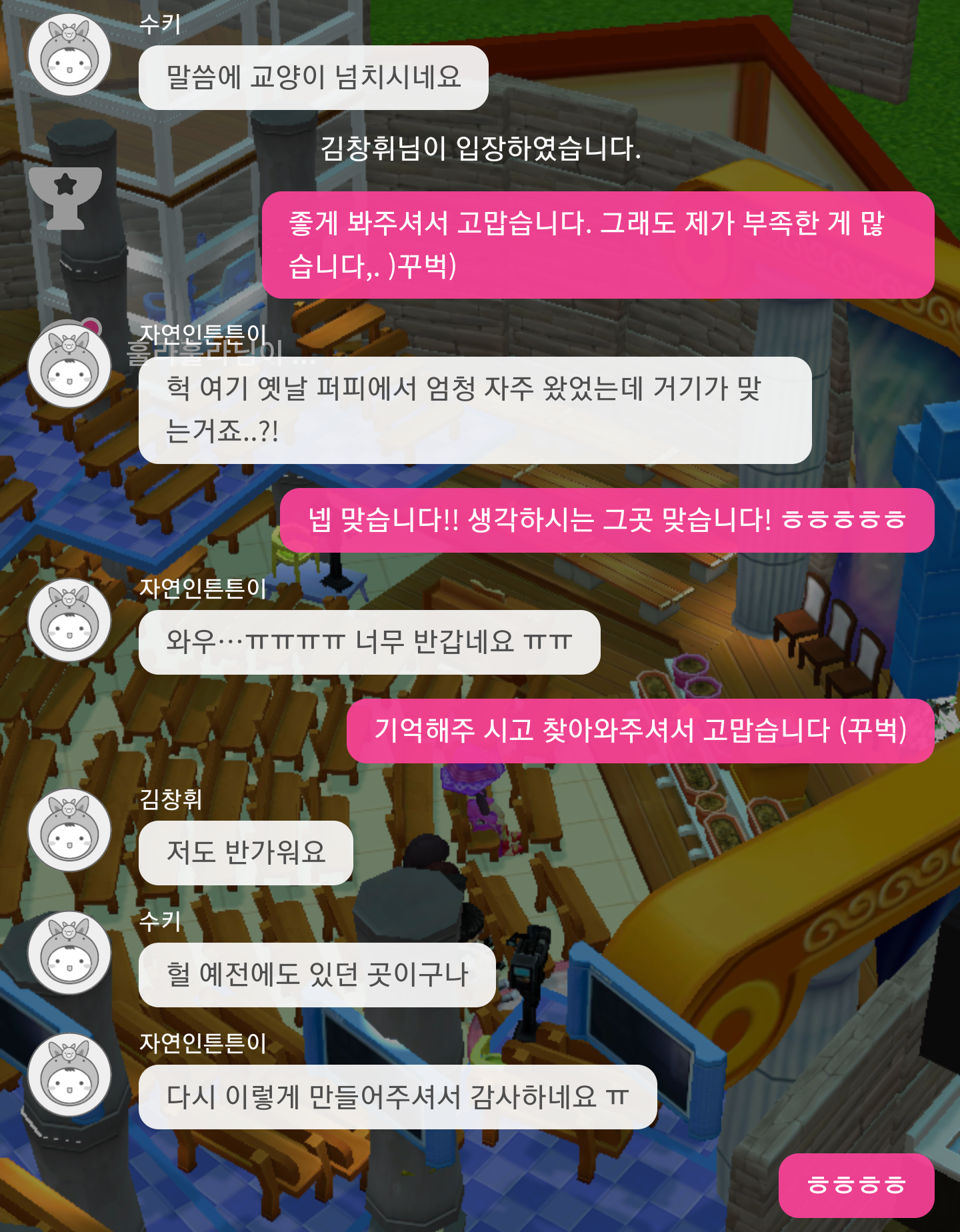 “어릴 때 여기 들어와서 힐링 많이 했었던… 다시 이렇게 만들어주셔서 감사하네요.” 교회를 방문한 ‘자연인튼튼이’씨가 과거를 회상했다. “처음에는 콘셉트인 줄 알았는데 진짜 교회 온 거 같이 기분 좋아져요 ㅋㅋㅠㅠ” 옆에서 ‘수키’씨가 거들었다.