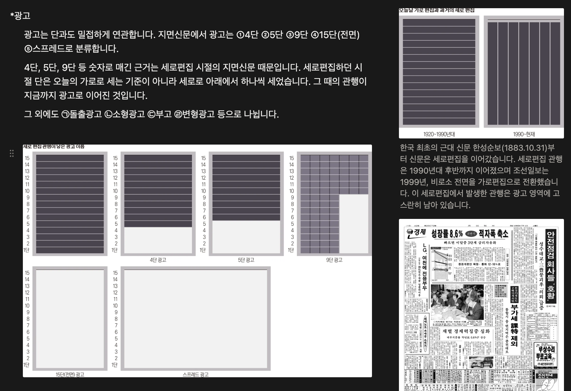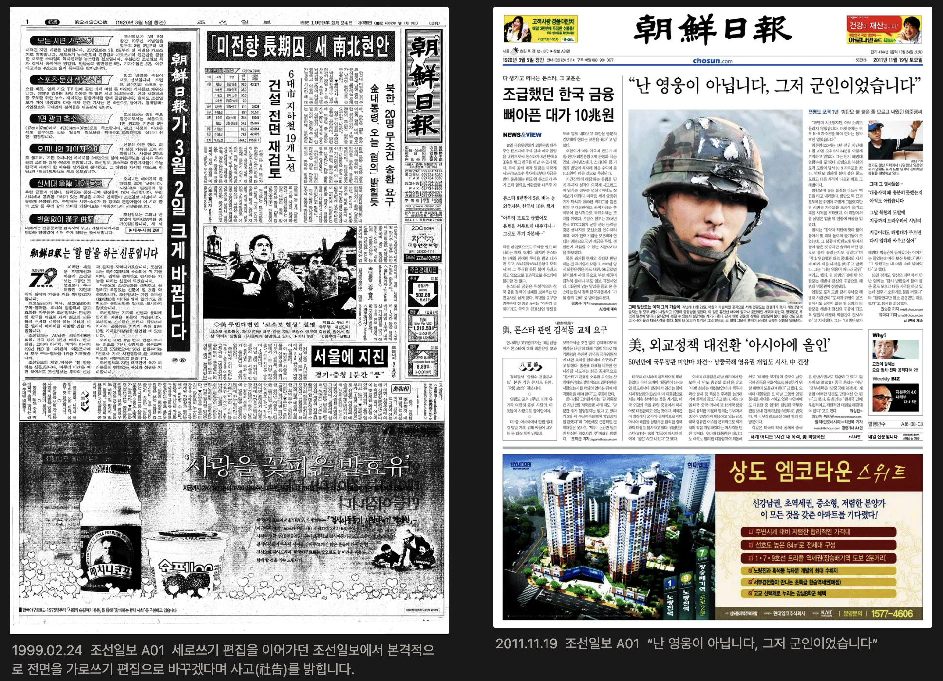 이를 추론하기 위해선 지면신문의 세로쓰기 체제 시절로 거슬러 올라가야 한다. 출판물은 대한민국 정부 수립부터 가로쓰기를 지향했다. 그렇다면 신문은 언제부터 세로쓰기에서 가로쓰기로 전환한 걸까. 놀랍게도 1990년대 후반이다. 책은 이렇게 말한다. “가로쓰기에 익숙한 한글세대가 독자의 대다수를 차지하기에 시대의 요청” “비주얼이 강조되고 여백의 미학이 등장해 디자인 마인드가 매우 중요하게 대두되었다.”(52)
