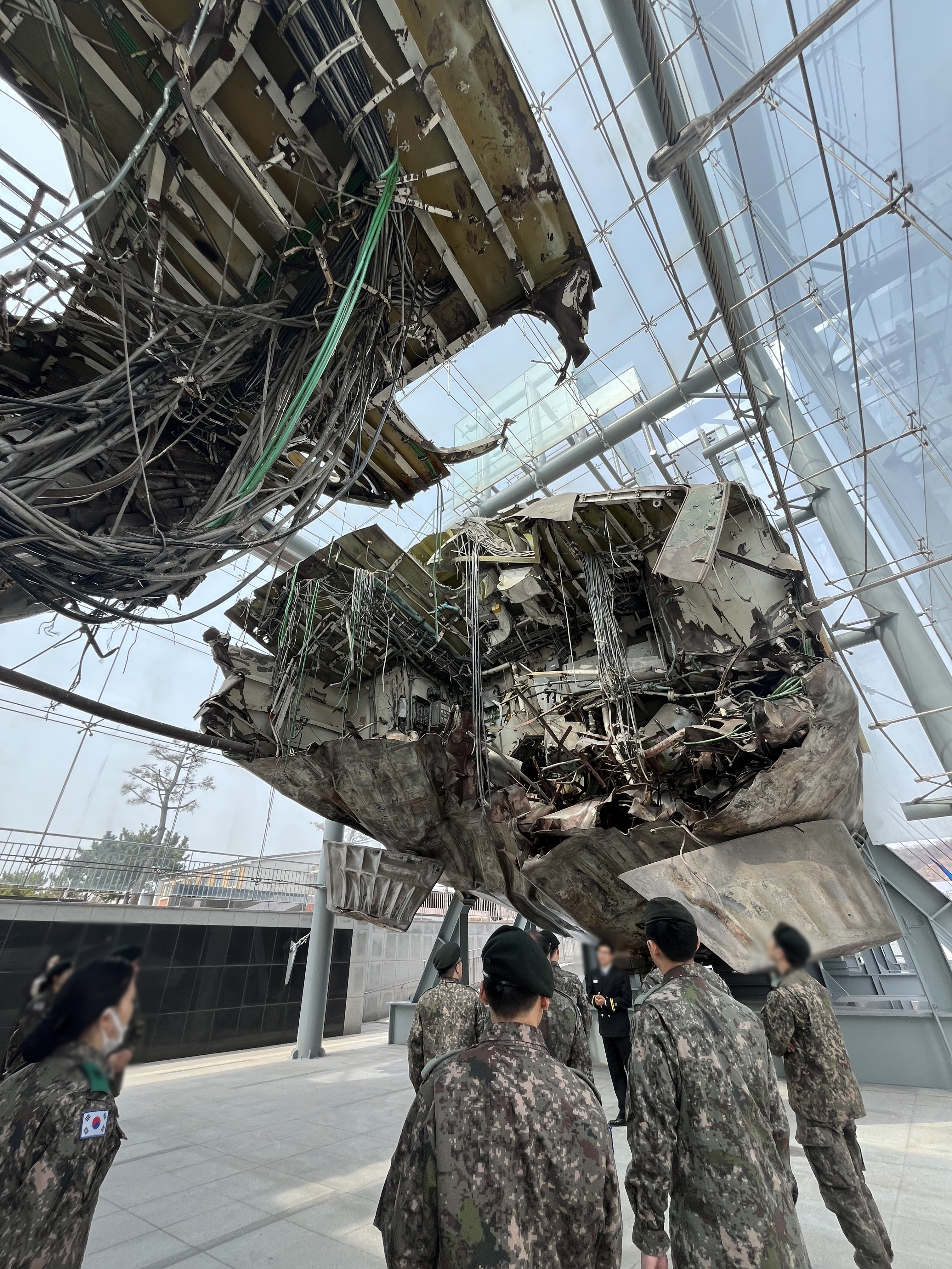 반파된 천안함 앞에서 한 장교가 14년 전 천안함 피격 사건을 구체적으로 설명하고 있다.