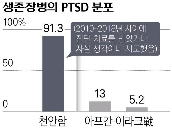 허나 천안함 생존장병에 대해 알려진 것은 거의 없었다. 천안함 생존장병 실태조사는 피격 8년이나 지난 시점에 이뤄졌다. 사건 이후 한 번이라도 PTSD 진단을 받거나 치료 받은 적이 있는 이의 비율은 91.3%에 달했다. 베트남 참전 미군의 30%에 비하면 압도적인 수치다. 2017년 한 해 PTSD를 진단받거나 치료받은 천안함 생존장병 비율은 50%였다. 아프가니스탄, 이라크 전쟁에 참여해 2001년부터 2005년까지 PTSD 진단을 받거나 치료받은 사람의 숫자는 전체의 13%였다.