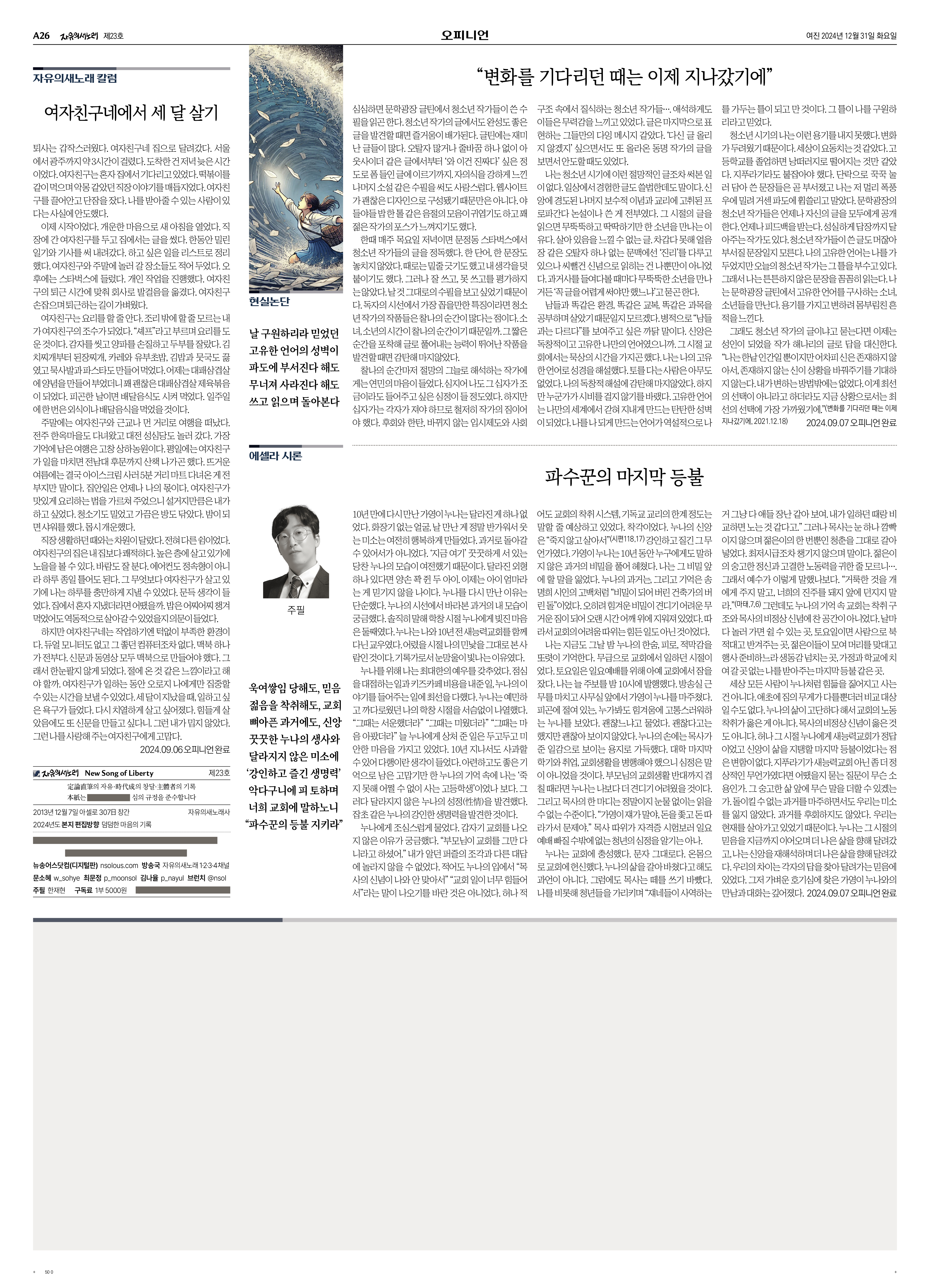 [에셀라 시론] 파수꾼의 마지막 등불 [현실논단] “변화를 기다리던 때는 이제 지나갔기에” [칼럼] 여자친구네에서 세 달 살기 |