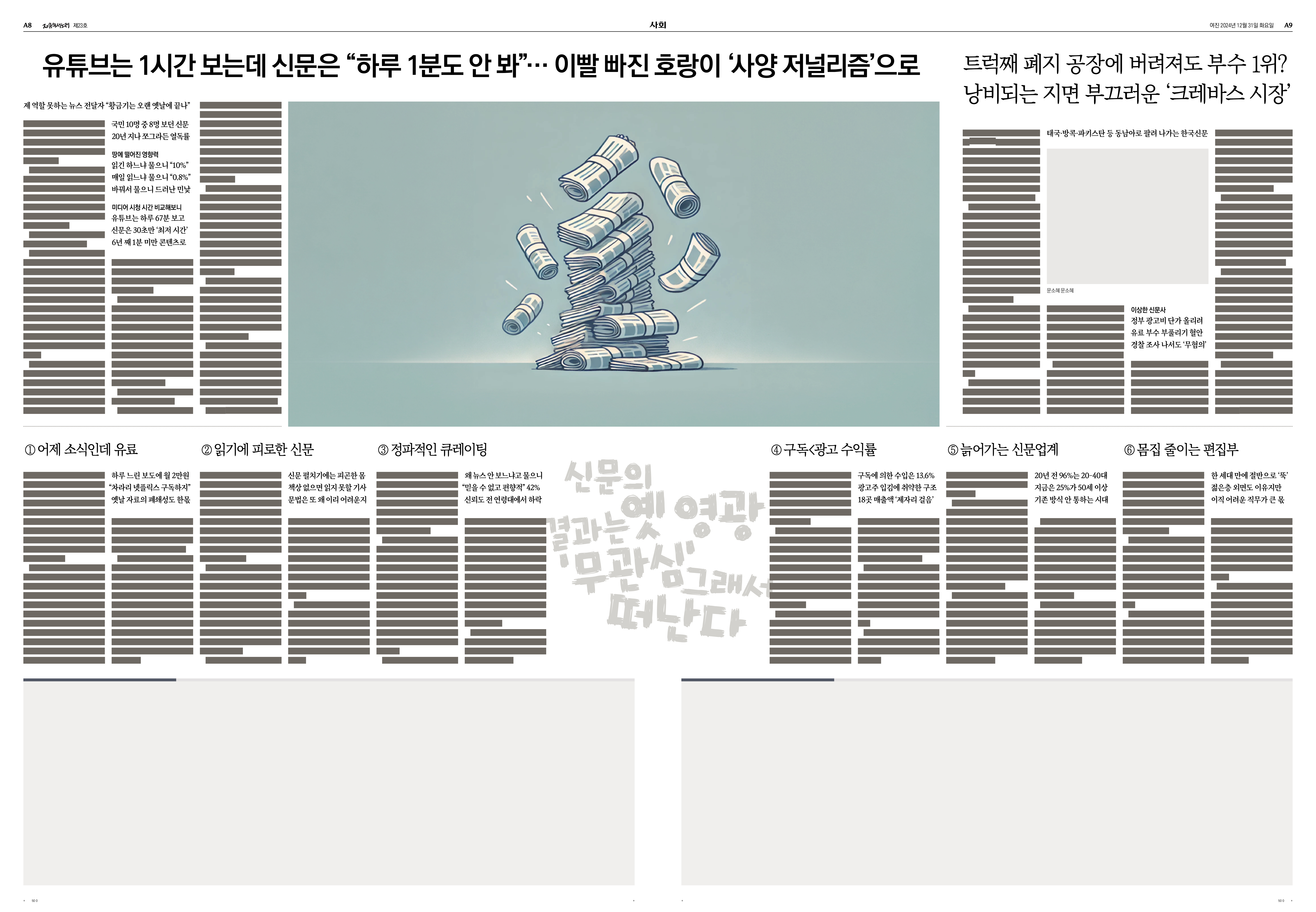 유튜브는 1시간 보는데 신문은 “하루 1분도 안 봐”… 이빨 빠진 호랑이 ‘사양 저널리즘’으로 ① 어제 소식인데 유료 ② 읽기에 피로한 신문 ③ 정파적인 큐레이팅 ④ 구독<광고 수익률 ⑤ 막말과 도제식 근무 ⑥ 늙어가는 신문업계 |