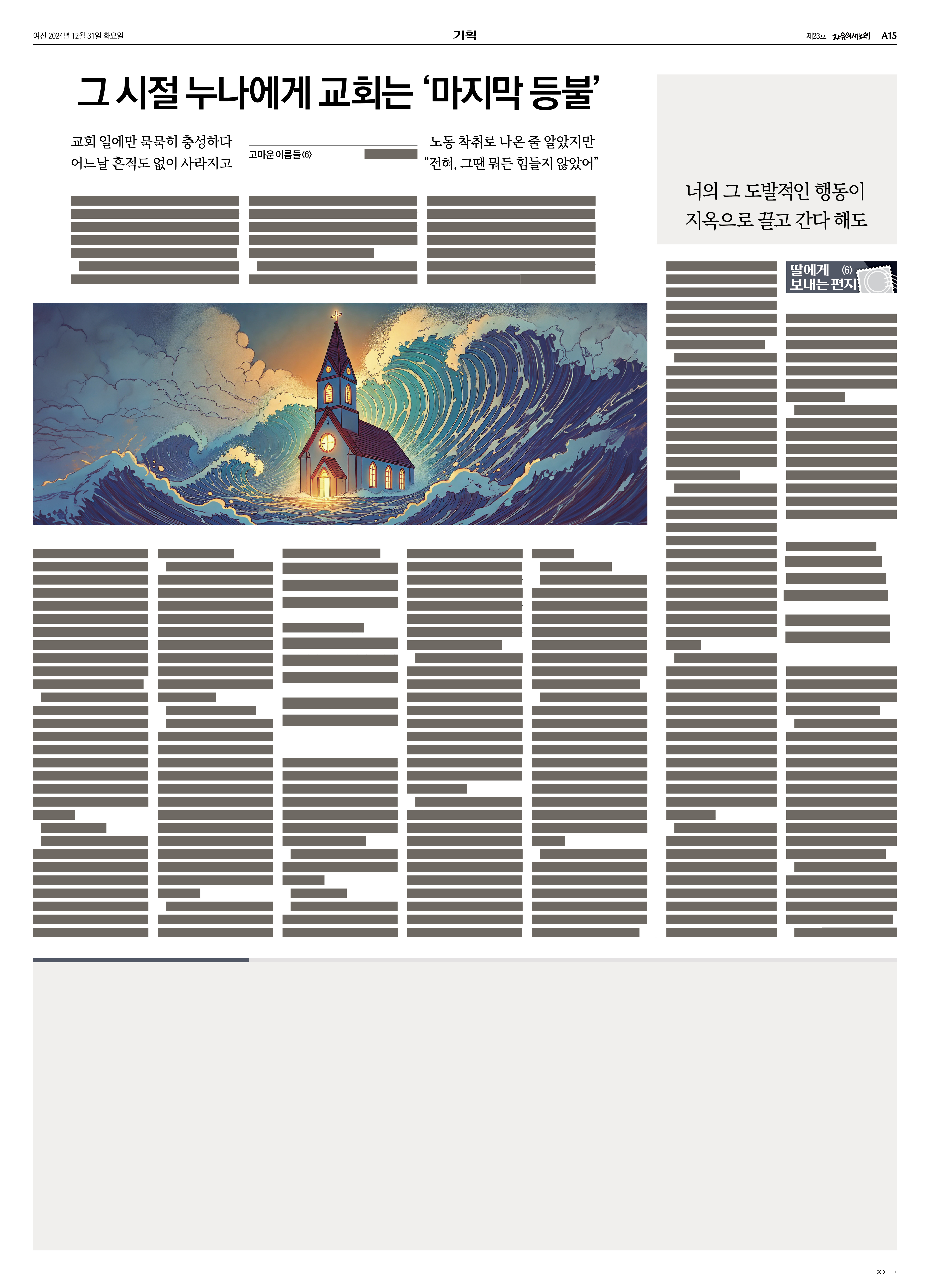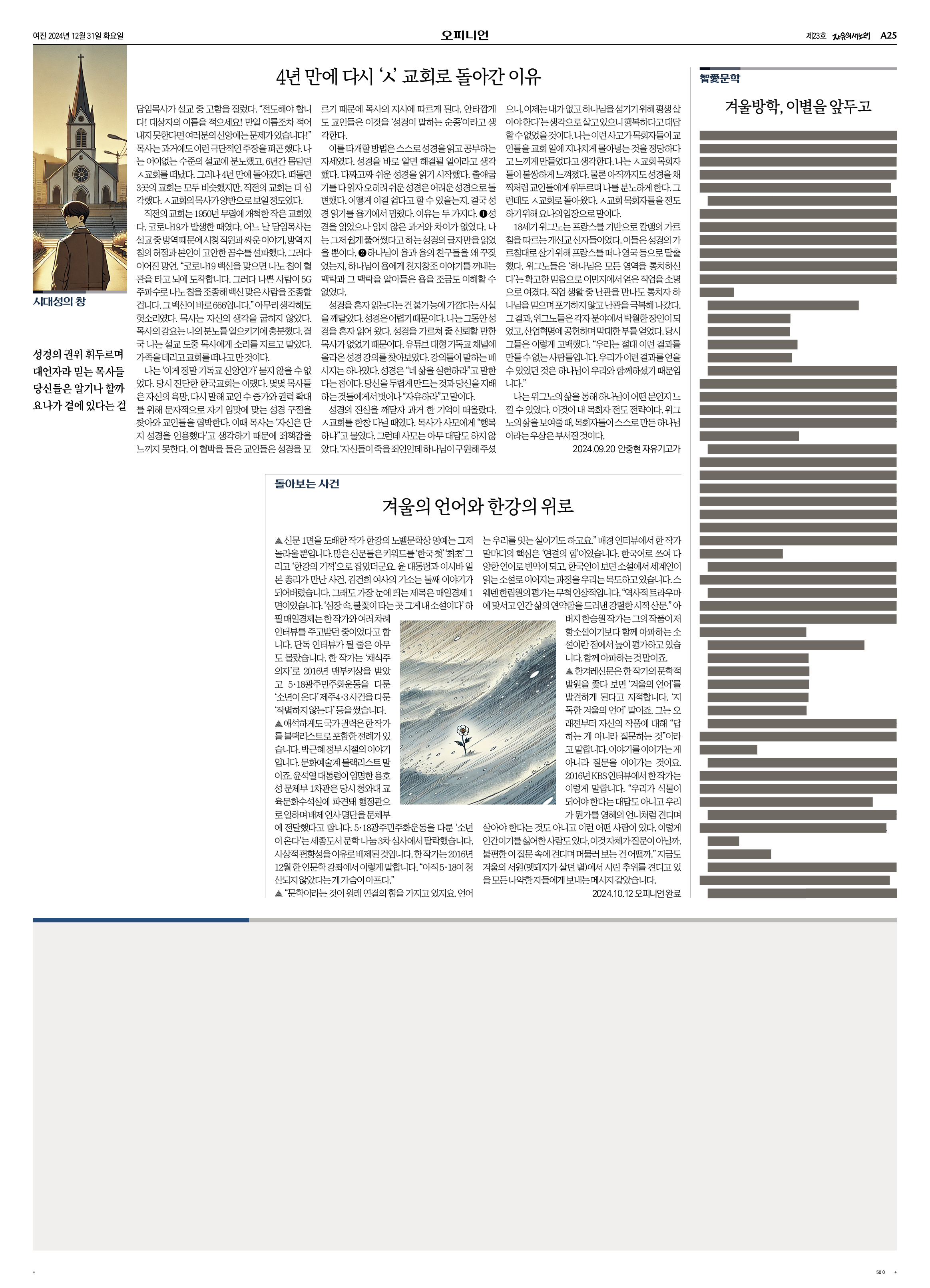 [시대성의 창] 4년 만에 다시 ‘ㅅ’ 교회로 돌아간 이유 [지애문학] 겨울방학, 이별을 앞두고 [돌아보는 사건] 겨울의 언어와 한강의 위로 |