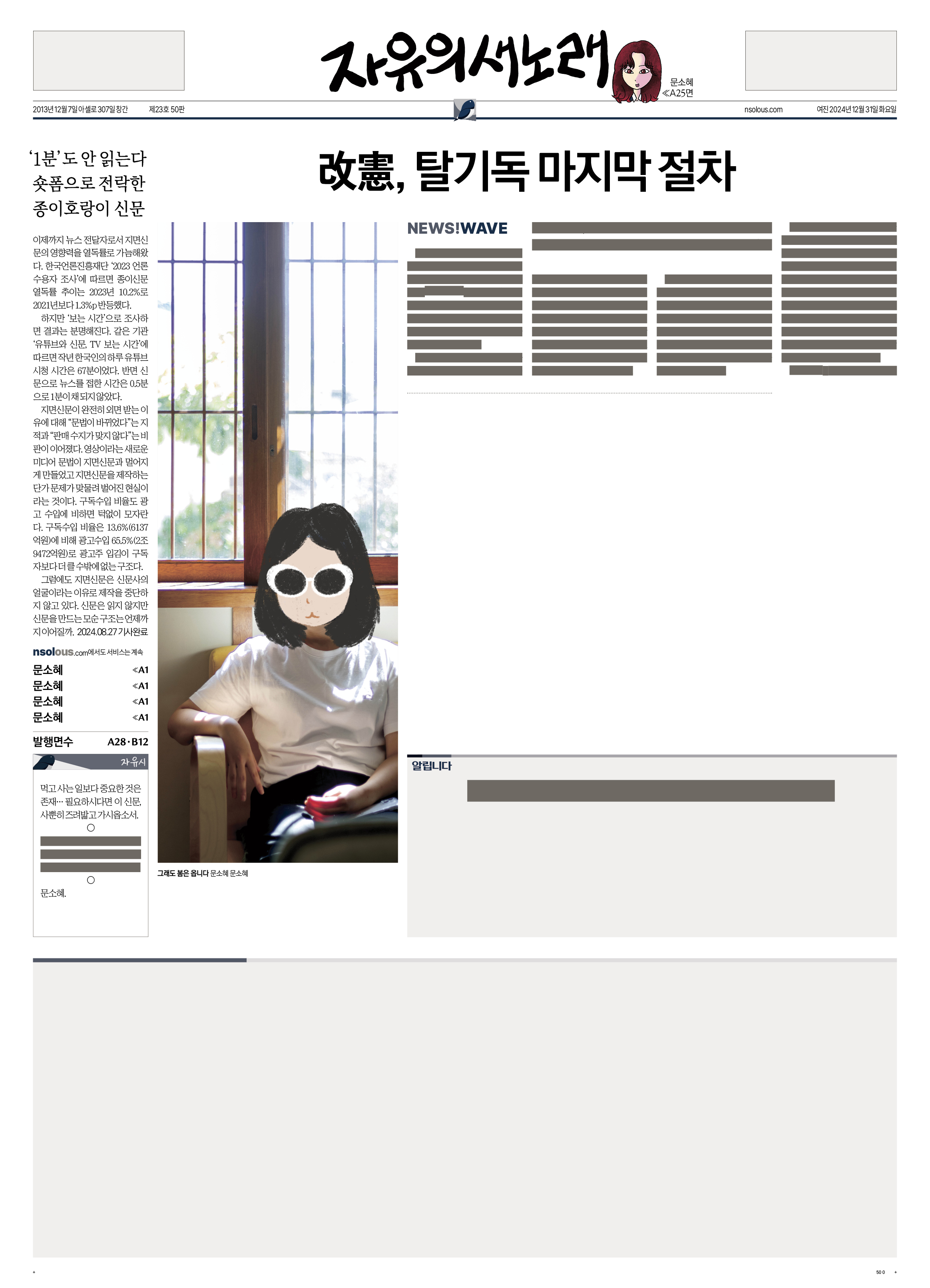 [NEWS!WAVE] 개헌, 탈기독 마지막 절차 ‘1분’도 안 읽는다 숏폼으로 전락한 종이호랑이 신문 [자유시] [문장의 힘] [알립니다] |