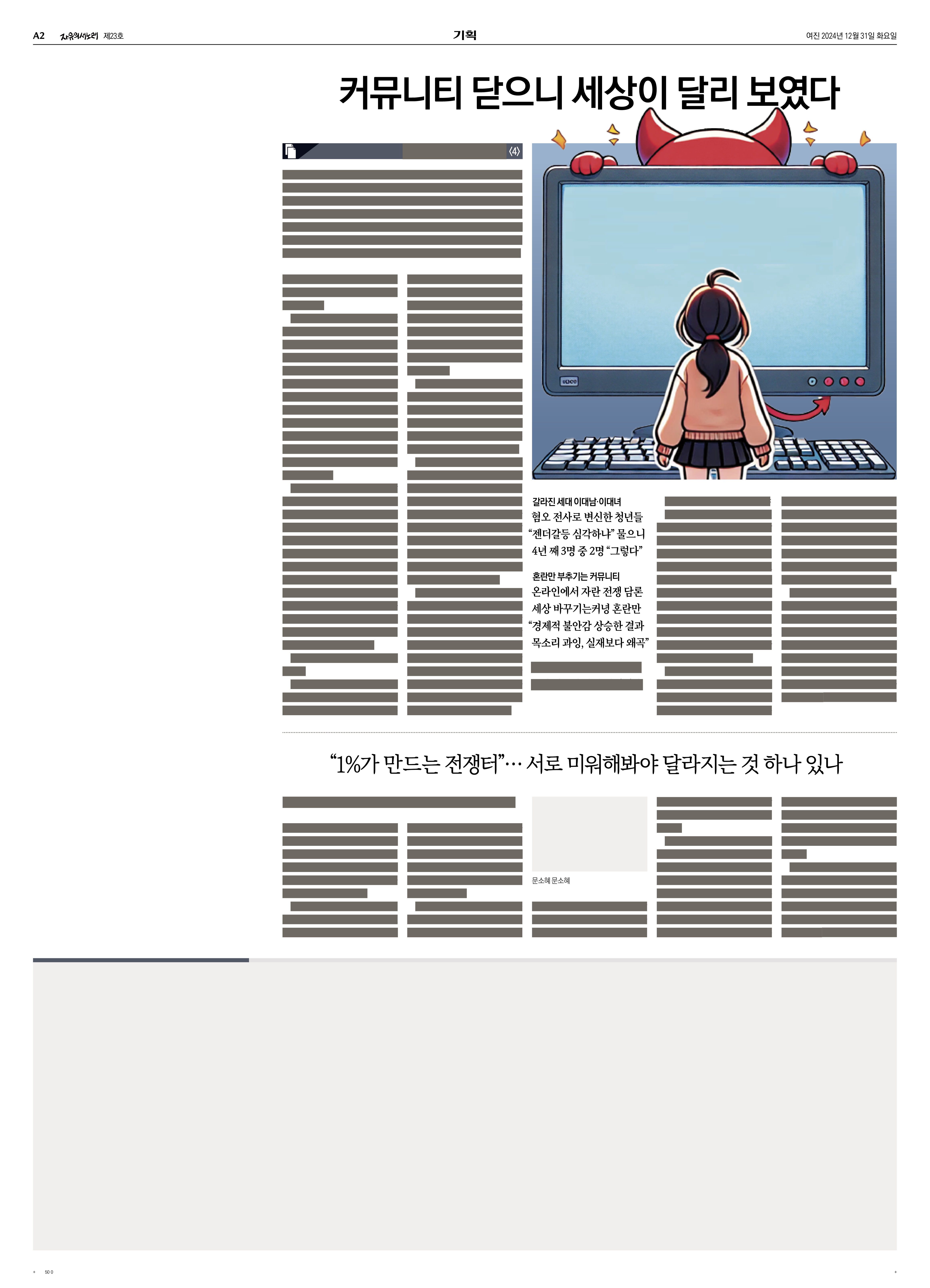 [여성해방을 넘어서] 커뮤니티 닫으니 세상이 달리 보였다 [여성해방을 넘어서] “1%가 만드는 전쟁터”… 서로 미워해봐야 달라지는 것 하나 있나 |