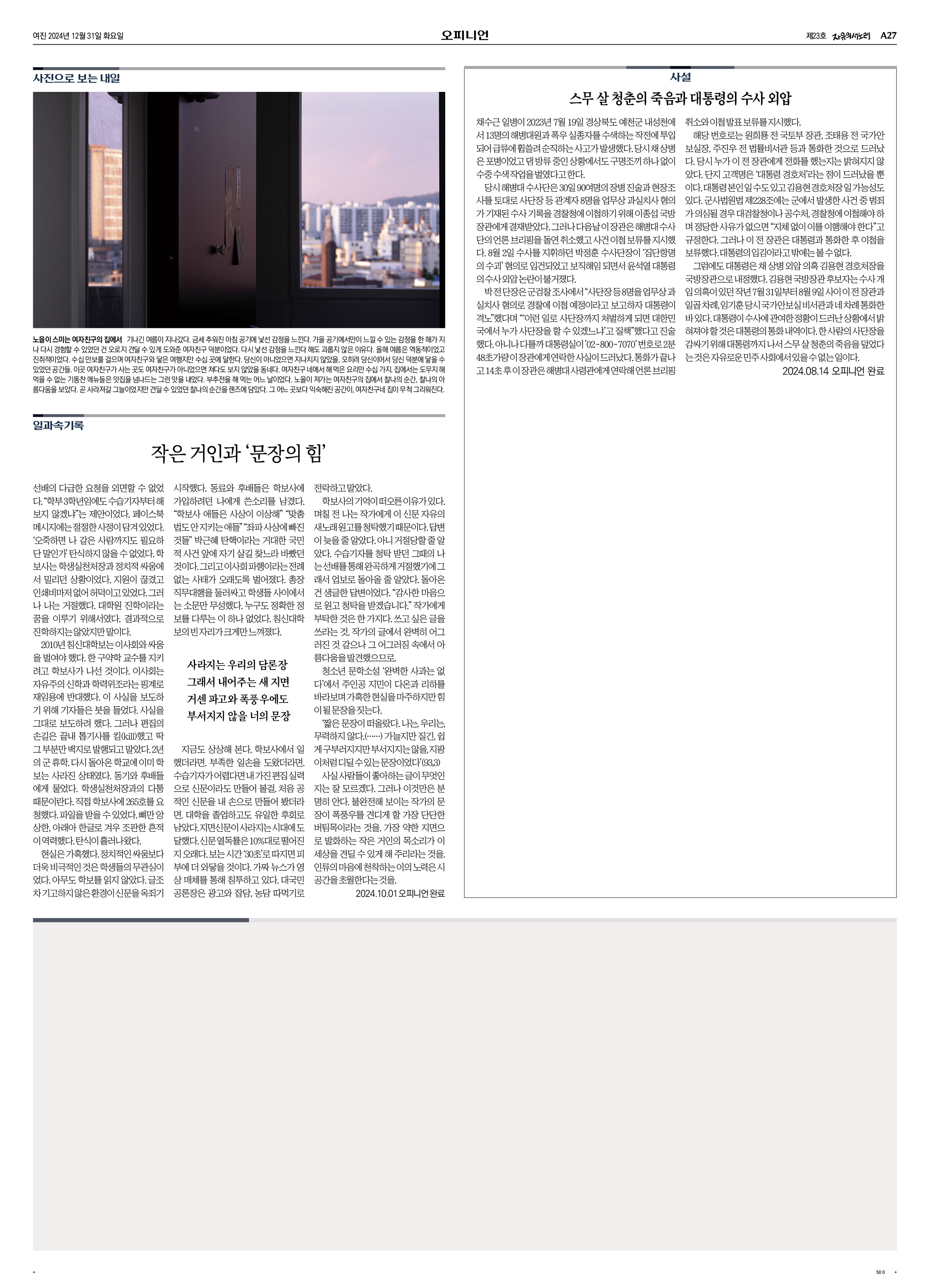 [사설] 스무 살 청춘의 죽음과 대통령의 수사 외압 [사진으로 보는 내일] 노을이 스미는 여자친구의 집에서 [일과속기록] 작은 거인과 ‘문장의 힘’ |