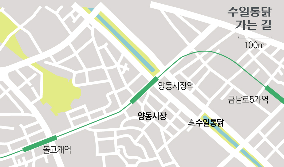 광주에서 쉬는 동안 반년 간 네 번을 찾아갔다. 두 달에 한 번은 꼭 찾게 되는 양동시장에 있는 수일통닭.