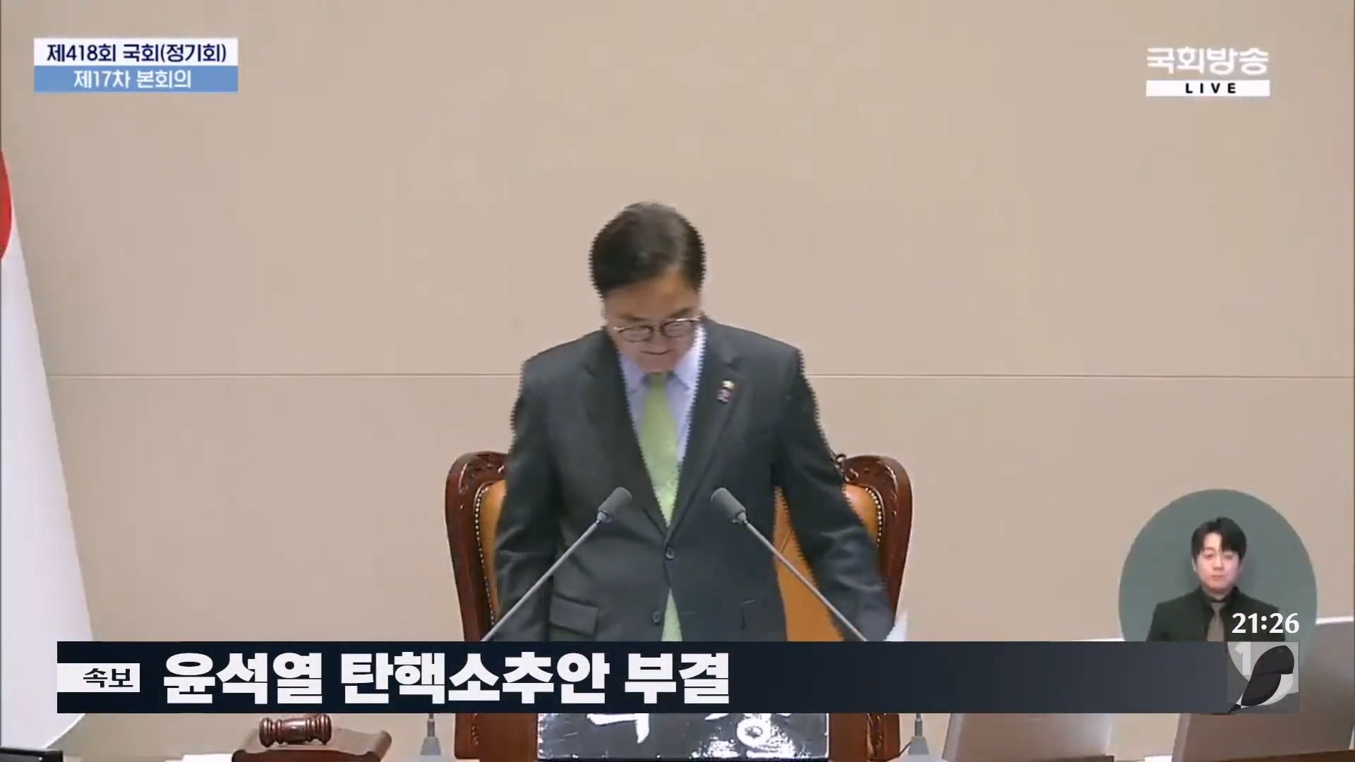 윤석열 대통령 탄핵소추안이 7일 국회 본회의에서 의결정족수 부족으로 무산됐다. 표결에는 재적 의원 300명 중 더불어민주당 등 야당 의원 192명과 국민의힘 안철수·김상욱·김예지 의원 등 195명만 참석했다. 국민의힘은 부결 당론으로 정하면서 김건희 특검법안 재표결에만 참여했고 이후에는 퇴장했다. 의결정족수 200명에 달하지 않아 탄핵안은 자동 폐기된 것이다.