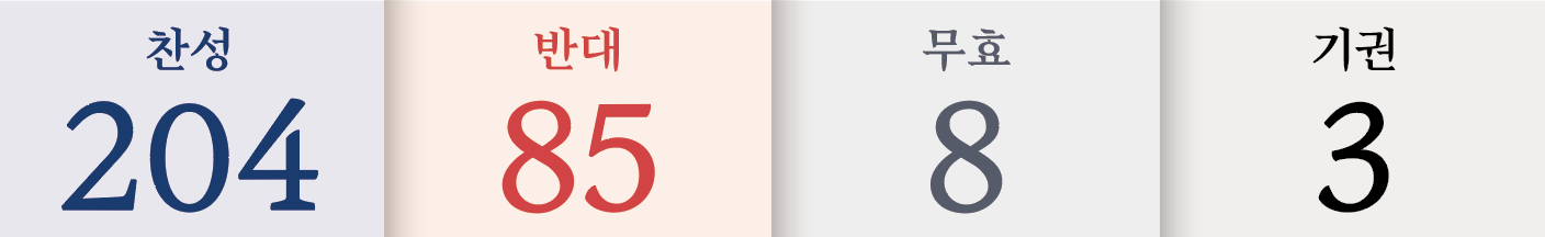 국회는 이날 오후 4시 본회의를 열어 재적 의원 300명 전원이 참석해 찬성 204표, 반대 85표, 무효 8표, 기권 3표로 탄핵소추안을 가결했다.