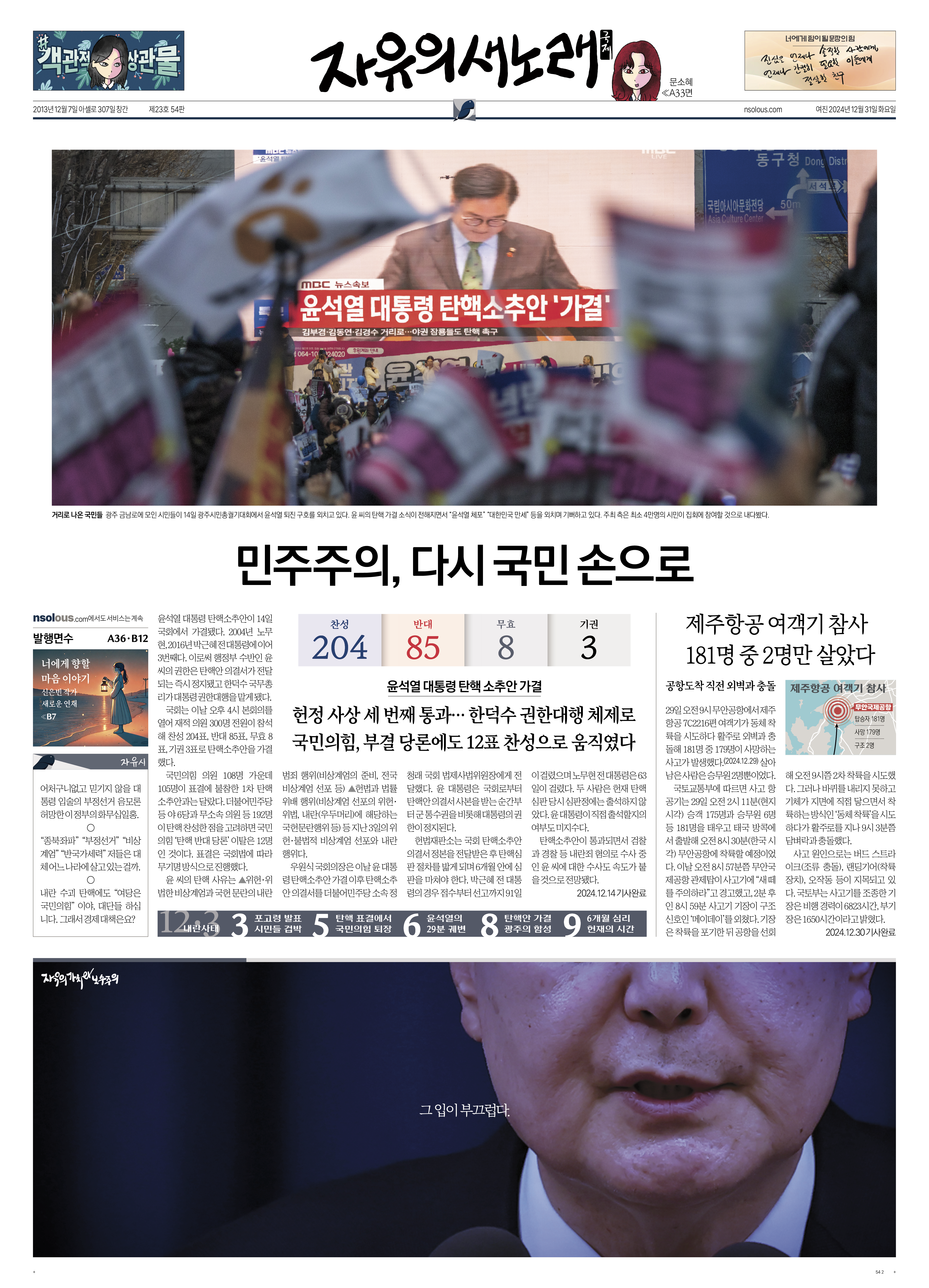 · 민주주의, 다시 국민 손으로 · 제주항공 여객기 참사 181명 중 2명만 살았다 · [자유시] 어처구니없고 믿기지 않을 대통령 입술의 부정선거 음모론 外