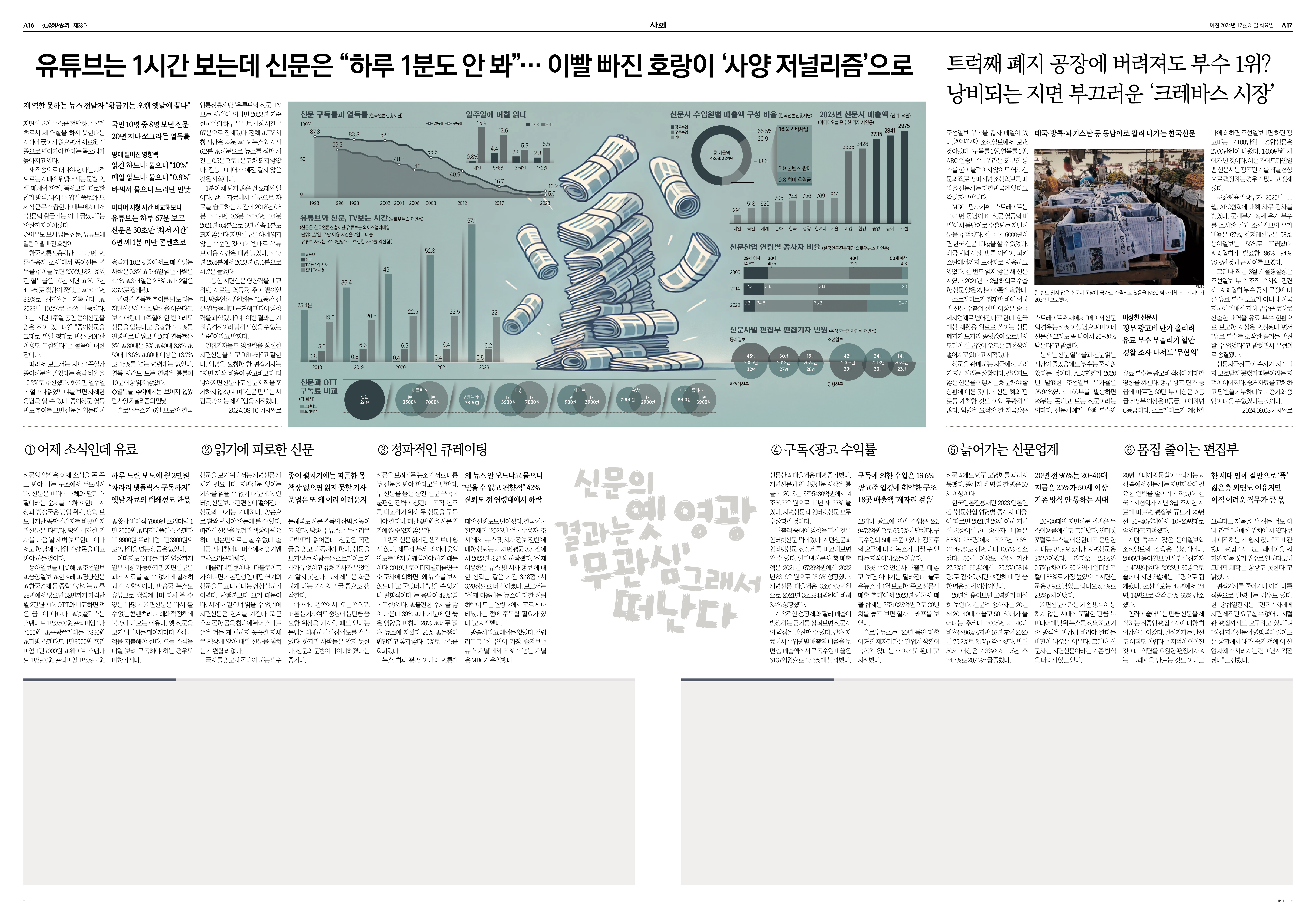 · 유튜브는 1시간 보는데 신문은 “하루 1분도 안 봐”… 이빨 빠진 호랑이 ‘사양 저널리즘’으로 · ① 어제 소식인데 유료 · ② 읽기에 피로한 신문 · ③ 정파적인 큐레이팅 · 트럭째 폐지 공장에 버려져도 부수 1위? 낭비되는 지면 부끄러운 ‘크레바스 시장’ · ④ 구독<광고 수익률 · ⑤ 늙어가는 신문업계 · ⑥ 몸집 줄이는 편집부