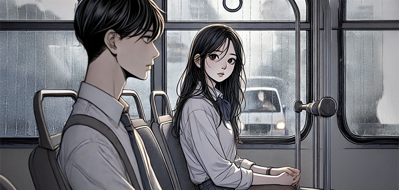 “안녕? 여기 버스 기다리는 사람, 우리 둘뿐이네. 어디 가는 길이야?”
