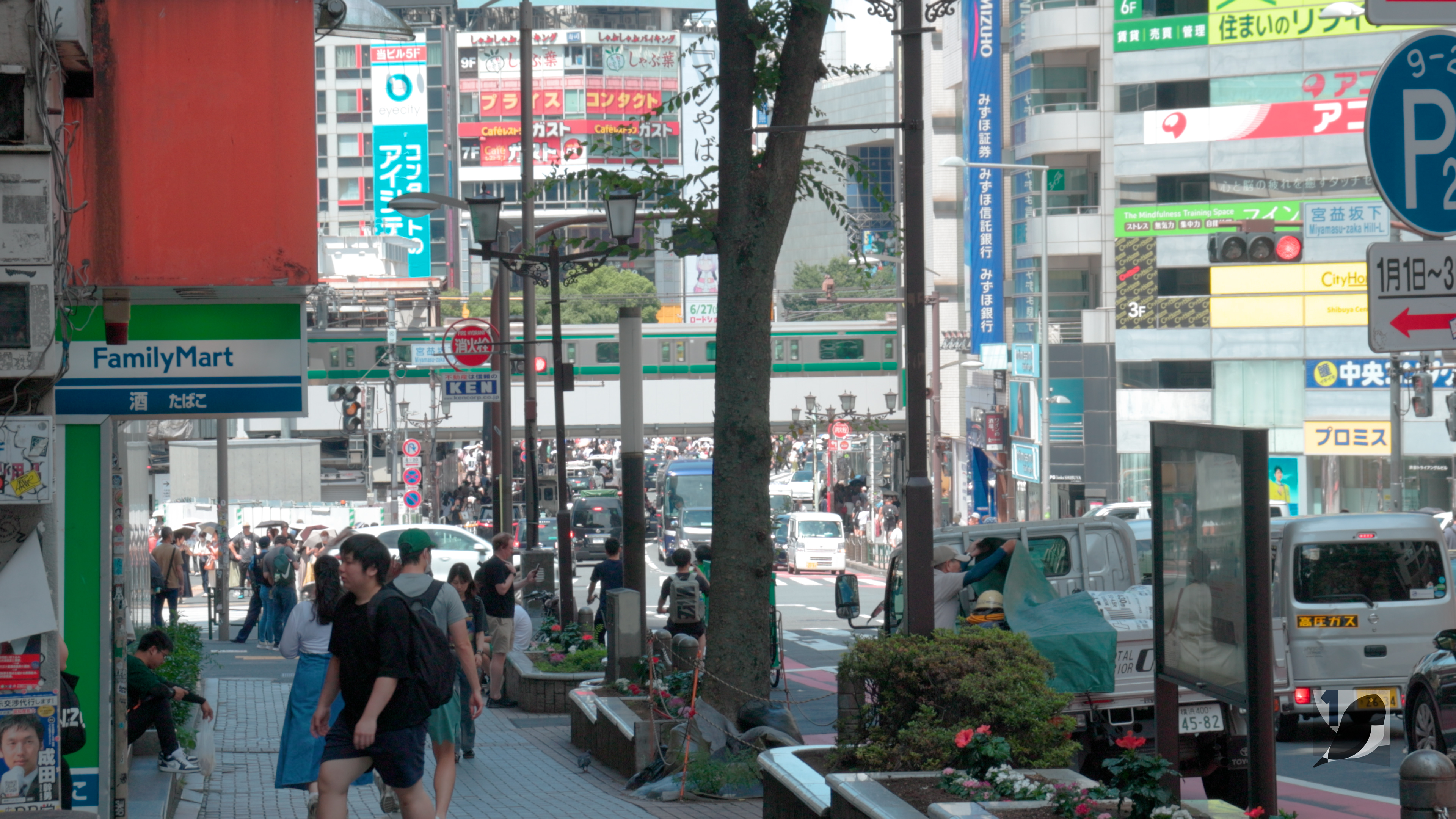 압도하는 거대한 건물들 시부야, 인파 밀림 속에서