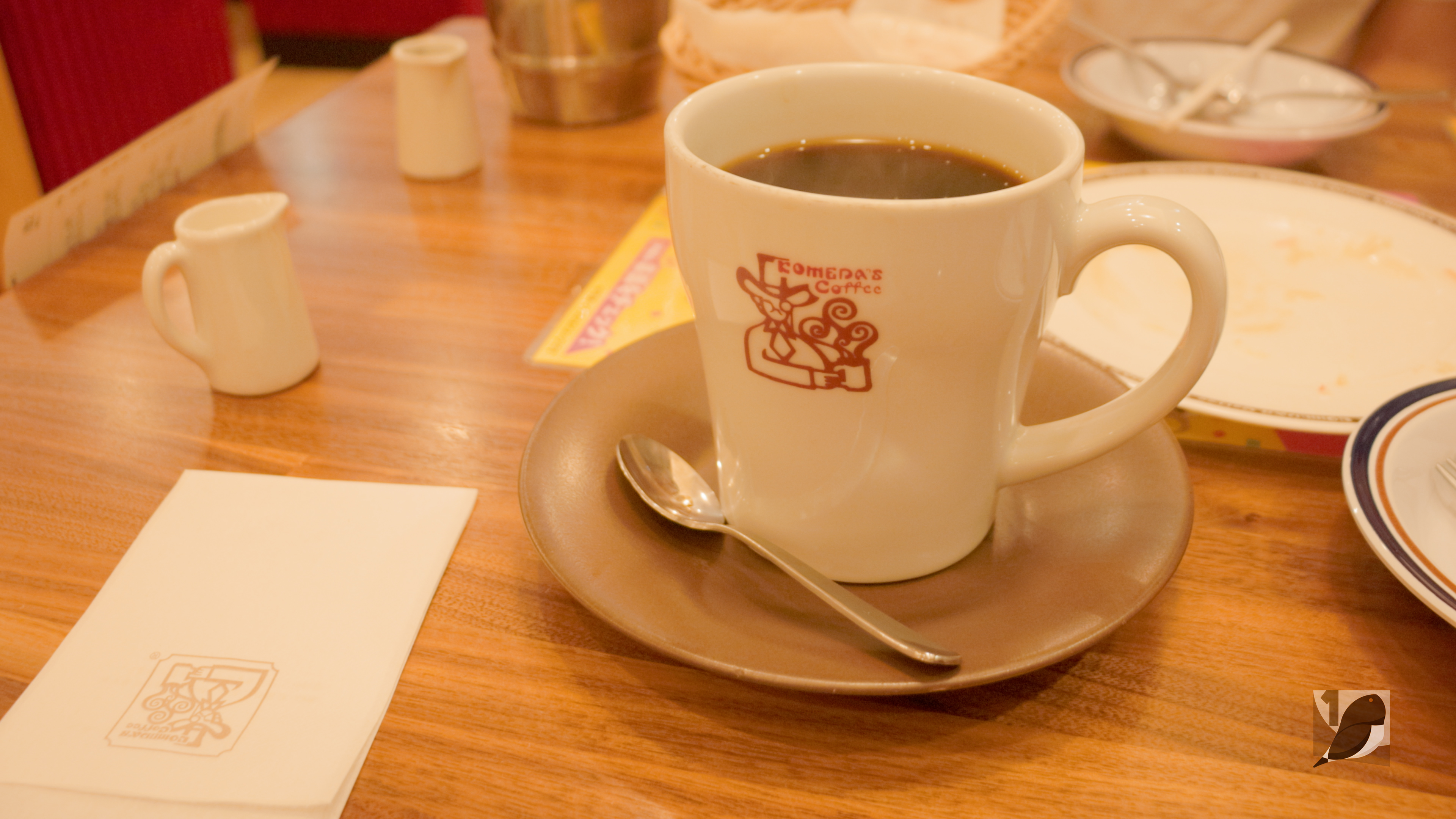 커피를 즐기면서 코메다커피만의 엔틱한 분위기가 뒤늦게 시야에 들어왔다. 구획을 나눈 단단한 나무 파티션, 빨간색 소파의 푹신함. 코메타커피의 상징 같았다. 미니 샐러드 300엔, 아이스커피 800엔, 블렌드 커피 800엔. 한국 돈 1만9000원으로 충분한 조식을 즐겼다.